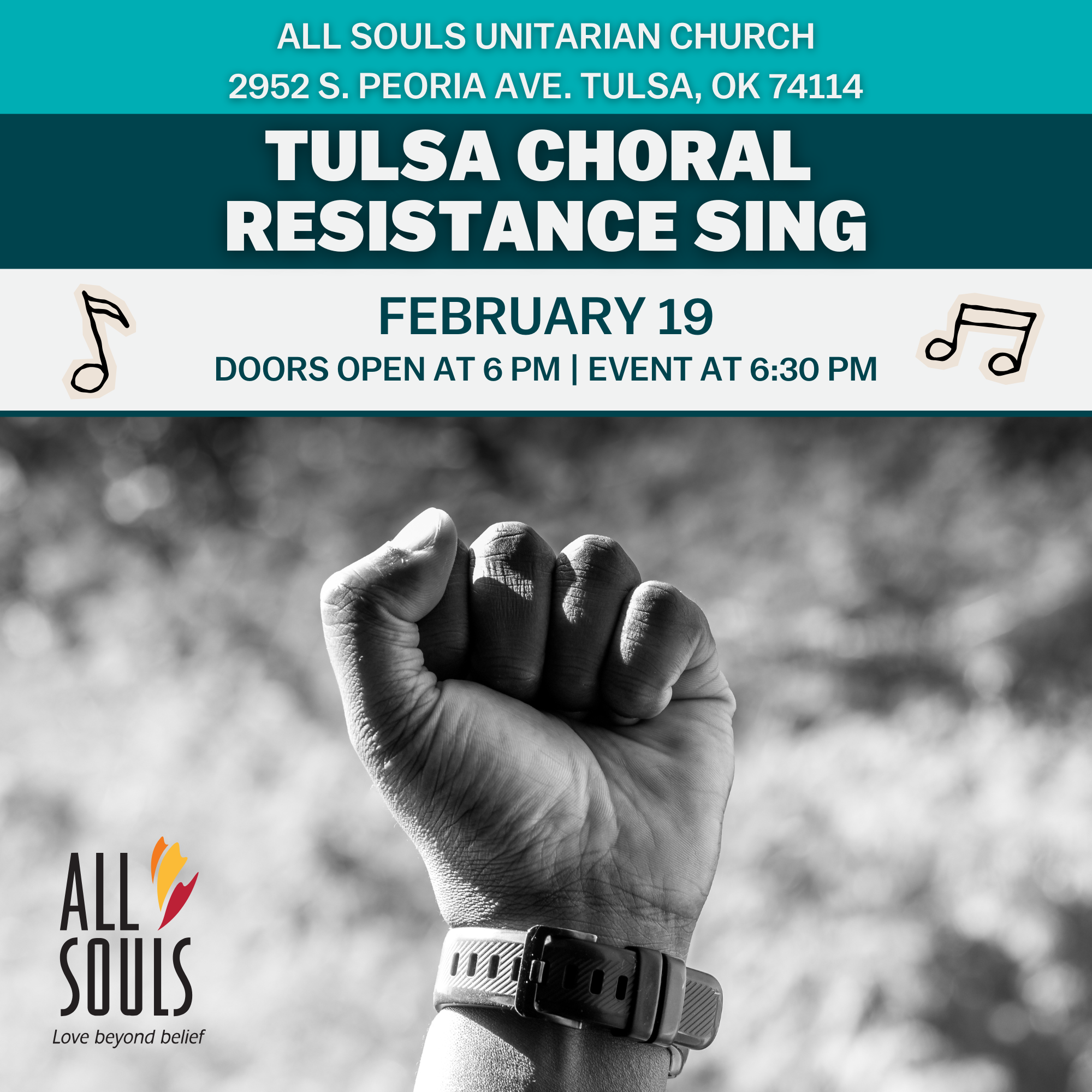 On Thursday, February 19, All Souls Unitarian Church invites EVERYONE - Tulsa-area musicians, churches, community choirs, and all our neighbors - to the Tulsa Choral Resistance Sing: an evening of beautiful choral music, hymns, and protest songs centered on peace, love, unity, and community.