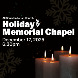 The holidays can make grief feel especially close - join us for a service that offers space for anyone remembering a loved one on December 17, 2025 at 6:30pm. The All Souls ministers will read the names of those who have passed within the last year, and all are welcome to speak the names they carry in remembrance.